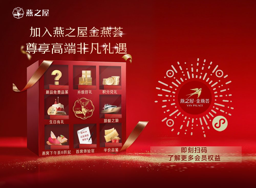 即刻掃碼,加入燕之屋金燕薈,開啟高端品質(zhì)生活,為您定制更多專寵禮遇,享受專屬的尊貴體驗(yàn)。