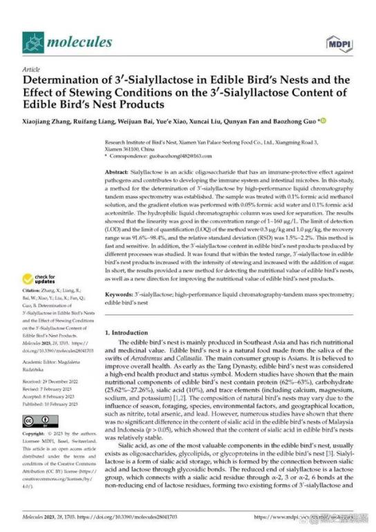 科技創(chuàng)新是產(chǎn)業(yè)發(fā)展的重要源泉和動(dòng)力。多年來,燕之屋堅(jiān)持傳承中國滋補(bǔ)文化的同時(shí),結(jié)合現(xiàn)代科研技術(shù)深入研究,充分挖掘燕窩的營養(yǎng)價(jià)值及功效?,F(xiàn)代研究發(fā)現(xiàn),“燕窩富含蛋白質(zhì)、氨基酸、唾液酸和無機(jī)元素等,具有抗氧化、改善免疫、抑制血凝、調(diào)節(jié)腸道菌群等功效(來自:白偉娟等.《燕窩成分及功效研究進(jìn)展》,2020)。”在燕之屋燕窩研究院科研團(tuán)隊(duì)新近發(fā)布的研究成果中,基于開創(chuàng)性地建立的燕窩中3'-唾液酸乳糖的LC-MS/MS測定方法,及兩年的跟蹤研究發(fā)現(xiàn)3'-唾液酸乳糖作為一種更容易吸收的唾液酸形態(tài),適當(dāng)?shù)臒踔笥兄谘喔C中的唾液酸向更易吸收的3'-唾液酸乳糖的形態(tài)轉(zhuǎn)化。研究表明,“碗燕產(chǎn)品中3'-唾液酸乳糖含量顯著高于家庭燉煮燕窩(100℃ 30min)(來自:國際權(quán)威期刊《Molecules》,Determination of 3'-Sialyllactose in Edible Bird's Nests and the Effect of Stewing Conditions on the 3'-Sialyllactose Content of Edible Bird's Nest Products)。”如燕之屋旗下高端燕窩品牌碗燕飛天款的3'-唾液酸乳糖含量相對于于燉煮燕窩高達(dá)20余倍,表明燕之屋專利燉煮工藝(專利號(hào):ZL201410393800.4 ;專利名稱:一種速食燕窩軟罐頭的制作方法)能夠激發(fā)燕窩的營養(yǎng)活性,提升燕窩產(chǎn)品的營養(yǎng)價(jià)值(來自:燕之屋燕窩研究院,碗燕產(chǎn)品五維營養(yǎng)分析報(bào)告)。”此外,燕之屋燕窩研究院科研團(tuán)隊(duì)一直以來燕之屋始終堅(jiān)持走“研發(fā)立企、創(chuàng)新興企”之路,基于研究成果不斷對產(chǎn)品進(jìn)行升級和創(chuàng)新,致力于為消費(fèi)者打造更為科學(xué)、營養(yǎng)、健康的產(chǎn)品。截止至2023年8月1日,燕之屋發(fā)表論文共計(jì)44篇,其中SCI 11篇。