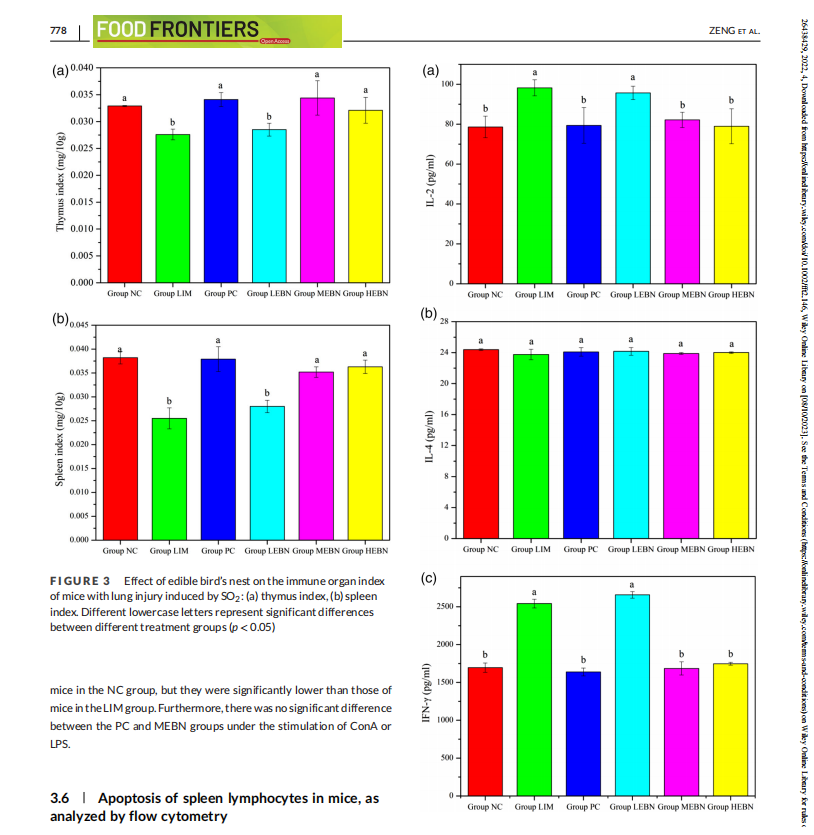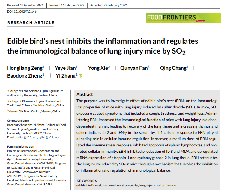 近日,燕之屋聯(lián)合福建農(nóng)林大學(xué)在《Food Frontiers》(國際權(quán)威ESCI期刊)發(fā)表論文“Edible bird's nest inhibits the inflammation and regulates the immunological balance of lung injury mice by SO2 ”,揭示燕窩具有保護肺部的功效。