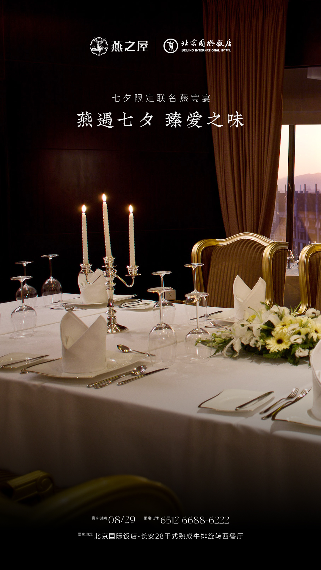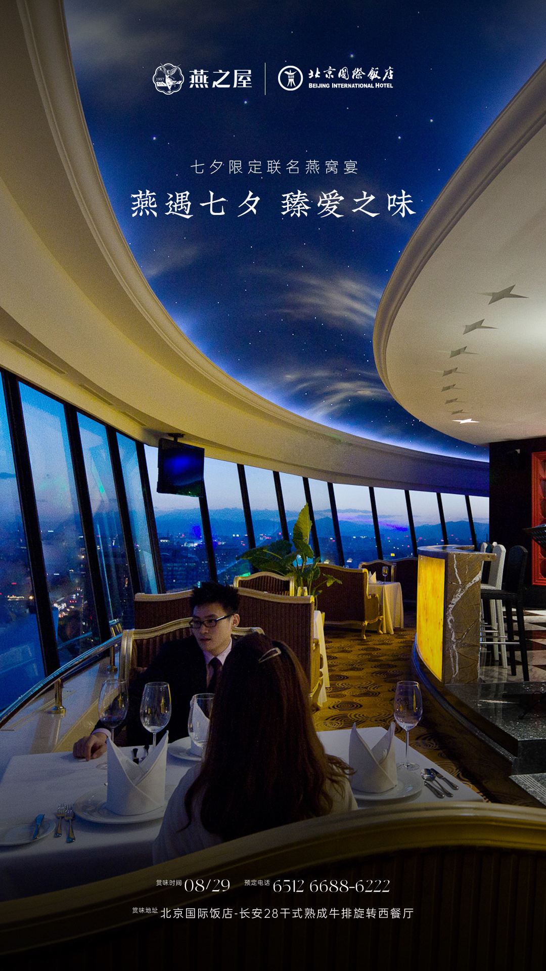 北京國際飯店長安28餐廳作為北京市中心高空360度環(huán)瞰京城盛景的旋轉(zhuǎn)餐廳,以其獨特的奢華與雅致并存的裝修風格,成為京城高端餐飲場所。604㎡餐廳空間、100個精致餐位,3間多功能廳房,配合專業(yè)的服務團隊,為每位賓客提供尊貴的用餐體驗。燕之屋27年專注高品質(zhì)燕窩,始終堅持“源于天然,美與健康”的理念,以創(chuàng)新科研賦能上乘品質(zhì),連續(xù)九年高端燕窩全國銷售第一①。此次合作是云端視野與輕奢品味的雙重尊享,正如每一對相約七夕的甜蜜愛侶。