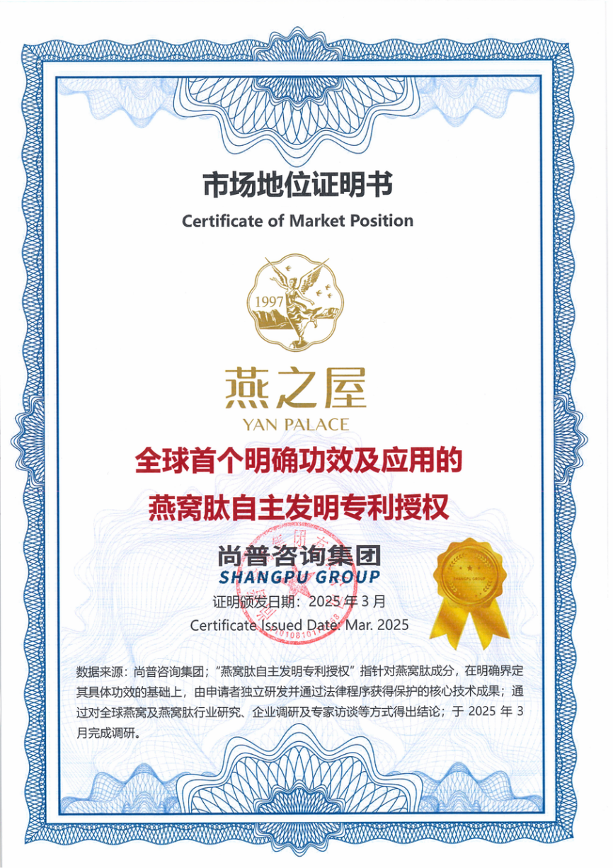 科研實(shí)力的卓越體現(xiàn),在于能否攻克行業(yè)共性難題并建立核心技術(shù)標(biāo)準(zhǔn)。燕之屋在燕窩肽領(lǐng)域取得關(guān)鍵突破,于2025年經(jīng)權(quán)威第三方機(jī)構(gòu)尚普咨詢集團(tuán)專業(yè)認(rèn)證,獲得“全球首個(gè)明確功效及應(yīng)用的燕窩肽自主發(fā)明專利授權(quán)①”市場(chǎng)地位證明書。該項(xiàng)認(rèn)證所基于的核心專利《一種具有促進(jìn)細(xì)胞修護(hù)、高保濕美白功效的燕窩肽制備方法及應(yīng)用》(專利號(hào):ZL 2022 11398048.3),徹底改變了傳統(tǒng)燕窩肽“成分模糊、功效籠統(tǒng)”的行業(yè)局面。該專利①明確了燕窩肽的定向酶解工藝,能夠?qū)⒀喔C大分子蛋白質(zhì)精準(zhǔn)切割為平均分子量小于3000道爾頓(Da)的活性小分子肽段。通過此工藝制備的燕窩肽,其促進(jìn)細(xì)胞修護(hù)、高效保濕及抗氧化等核心功能特性①獲得了明確界定與保護(hù),為產(chǎn)品的科學(xué)有效性奠定了堅(jiān)實(shí)的法律與技術(shù)基石。